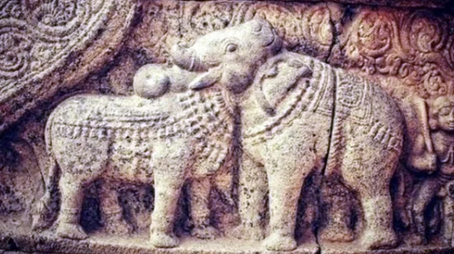 What do you see in this photo? You are looking at what may be the oldest documented optical illusion. It is a carving located at the Airavatesvara Temple in Tamil Nadu, India, which is a Hindu temple that dates back to the 12th century (1300s) AD. Among a myriad of carved avatars and chariots is this representation of what seems to be the bodies of two separate animals, with only one head between them in the foreground. The question we have to ask, then, is which animal is in the foreground? Is the head in the foreground front the head of the bull on the left or the head of the elephant on the right?