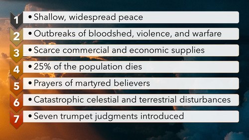 The best way to understand this description seems to be that the Tribulation will begin with a subjugation of nations throughout the world that produces a semblance of widespread unification and peace. This peace will occur primarily through diplomacy and the threat of war rather than outright warfare. This understanding corresponds well with how the antichrist will achieve a short-lived period of peace in the world that will persuade the nation of Israel to coalesce behind him in exchange for peace with other nations.