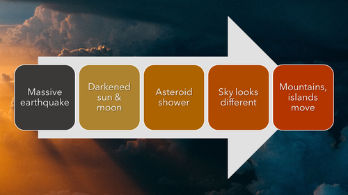 After this, or in close synchronization, a large meteor shower will pummel the earth, somehow triggering dramatic changes to the sky and weather patterns so that the sky looks like it’s rolling up like a scroll. In all of this upheaval, mountains and islands will move from their places due to seismic shifts in the earth’s tectonic plates.