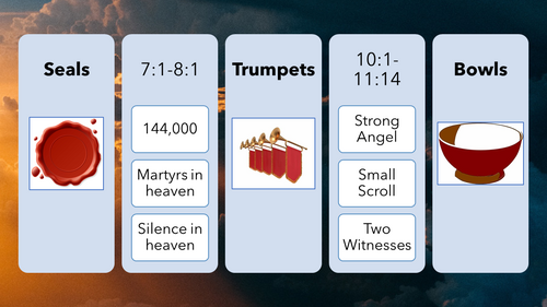 As John describes in chronological order the judgments Christ will release during the future Tribulation period, he does so as a sequence of three, seven-fold sets in a row: 7 seal judgments, 7 trumpet judgments, and 7 bowl judgments. Each seventh judgment introduces the following set but is also preceded by a dramatic intermission and pause that provides additional background information for the readers to take in.