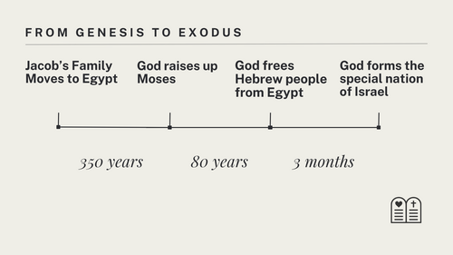 Between the last chapter of Genesis and the first chapter of Exodus had passed about 430 years, from the time Jacob the patriarch moved into Egypt and the time when Moses led all of Jacob’s descendants out (Exo 12:40-41). From Exo 1–18, approximately 80 years passed from the birth of Moses to when he led the Hebrew people out, through the Red Sea, and to Mount Sinai – where the 10 Commandments were given.